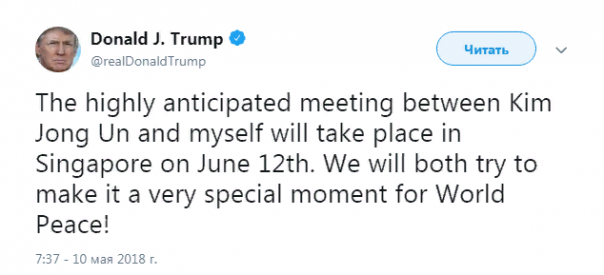 Дональд Трамп, президент США: «Моя долгожданная встреча с Ким Чен Ыном состоится в Сингапуре 12 июня. Мы оба постараемся сделать ее важным этапом в достижении мира во всем мире!».