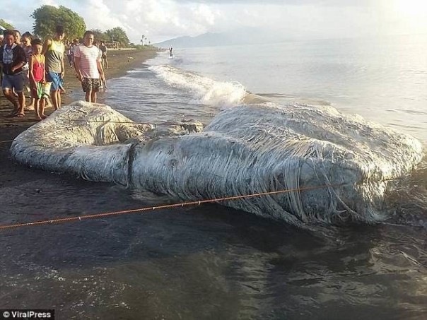 Учёные снова сбиты с толку. Они взяли образцы монстра для анализов и пока предполагают, что это разлагающиеся останки кита. Год назад подобное существо нашли на острове Динагат. Тогда заявлялось, что это касатка или ламантин.