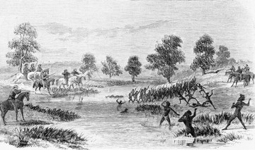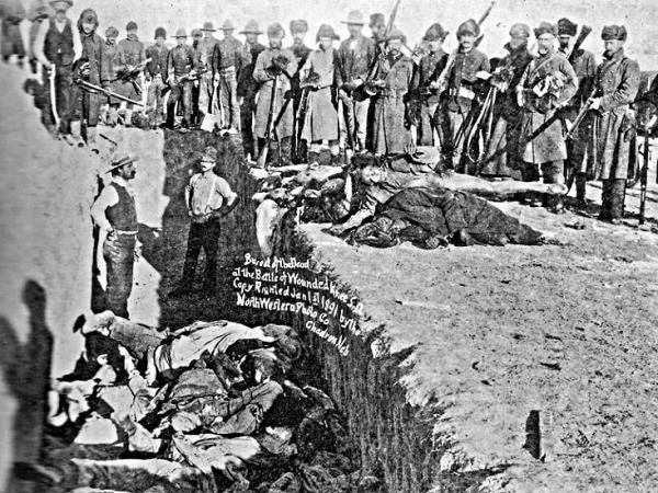 Массовая резня 29 декабря 1890 года. Тела сбрасывают в общую могилу, окруженную их убийцами и добровольцами, которым заплатили по $2 за каждое захороненное тело.