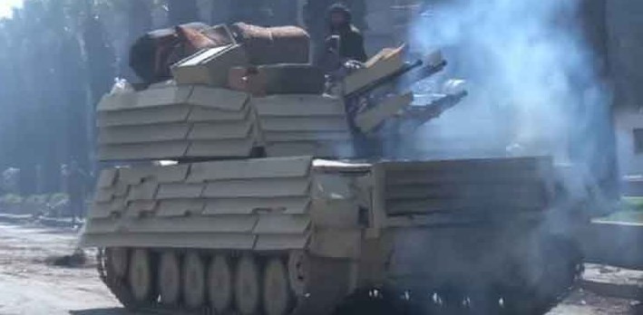 Сирийские ЗСУ-23-4 "Шилка", являющиеся отличным оружием против пехоты с оконечности улицы Дер Ясин подавляют огневые точки и снайперов противника, после чего вперед продвигаются штурмовые группы силовиков, зачищающие руины зданий.