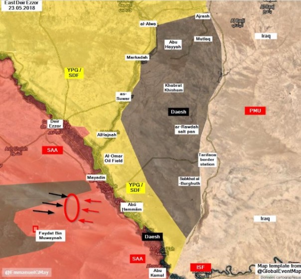 Вчера Сирийская арабская армия при поддержке палестинской бригады аль-Кудс и местных сил Национальной обороны отбила нападение ИГИЛ в пустыне к югу от аль-Меядина на юго-востоке Дейр эз-Зора. В результате столкновений было уничтожено по меньшей мере 15 боевиков.