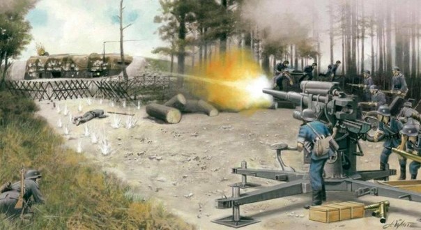 Ещё бодрее пошло дело у немецких зенитчиков в расстреле укреплений на берегу Рейна, в южном секторе линии Мажино. Методом «капля долбит камень не силой, но частотой падения», «ахт-комма-ахт» пробивали не только бронеколпаки, но и пару метров бетона, оставляя только хитросплетения арматуры. Неудивительно, что зенитки тащили через Рейн сразу за пехотой: выносить следующую линию бетонных коробок.