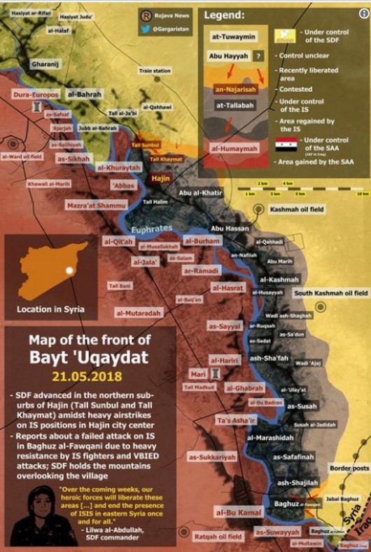 Согласно сведениям информационного Twitter-канала (@VivaRevolt), курдские радикалы Демократических сил Сирии (SDF) и западная коалиция, возглавляемая США, готовятся к операции по зачистке территорий на юго-востоке провинции Хасака у границы с Ираком от остатков отрядов «Исламского государства». Тем не менее необходимо отметить, что до сих пор продолжается военная кампания курдов и сил Соединенных Штатов в юго-восточной части соседнего Дейр-эз-Зора.