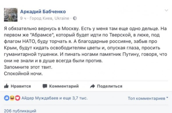 Это я об «Аркаше». Когда услышал о смерти Бабченко, только успел сказать: «Собаке собачья смерть» - и вдруг на тебе, живой! Не подумайте, что я злопамятный, просто память хорошая и зло не забываю.