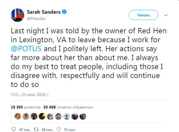 "Вчера вечером владелец Red Hen в Лексингтоне в штате Виргиния попросил меня уйти из-за того, что я работаю на президента США. Ее действия говорят гораздо больше о ней, чем обо мне", — написала Сандерс в Twitter.