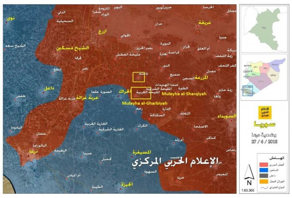 13.40 Армия Сирии продолжает наступать в Дераа. Части 5-й дивизии и дивизии «Тигры» успешно выбили противника из населенных пунктов Малиха-аль-Гарбия, Малиха-аль-Шаркия и бывшую базу 52 бригады, а также небольшой город Ракхам. В настоящий момент, вооруженные силы намерены окружить крупный оплот противника в данном регионе- город аль-Карак и вынудить противника отступить.