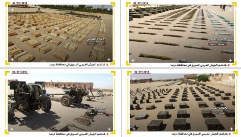 17.50 Армия Сирии представила первую партию трофеев, полученную при освобождении южных районов провинции Дераа. Сдавшиеся боевики передали военным имеющиеся у них боеприпасы и оружие, а также гаубицы Д-30. Предполагается, что в дальнейшем примеру ряда населенных пунктов, уже выступивших в поддержку армии и правительства Сирии, последуют и другие группировки.