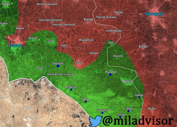 Военкор агентства САНА сообщил, что в населённых пунктах Ан-Наима, Аль-Джиза, Сейда и вблизи сирийско-иорданской границы армейцы наносили интенсивные удары по позициям террористов. Противнику причинен большой урон в живой силе и технике. Перекрыты основные линии снабжения боевиков оружием, что способствует ускорению освобождения районов от террористических группировок или же заставит их подчиниться условиям примирения, как это в последние дни случилось на севере и востоке провинции.