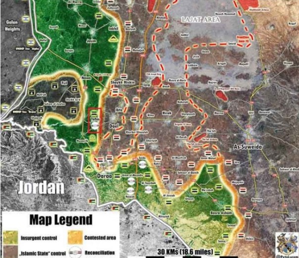 Идут ожесточенные бои вблизи города Умм-аль-Маядхин (Umm Al-Mayadhin), где боевики ССА (FSA) отказались от переговоров с правительством. Также идут бои у н.п. Аль-Тайба (Al-Taybah) вблизи перекрёстка Нассиб (Nassib).