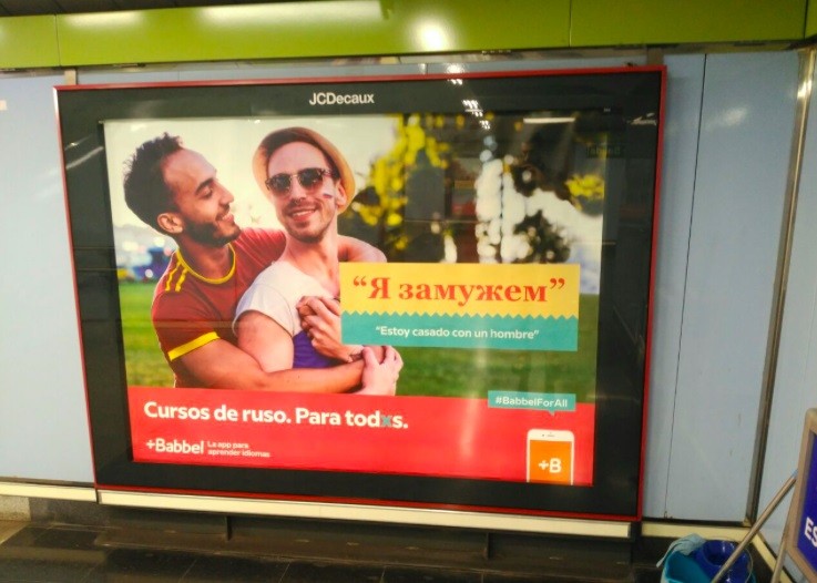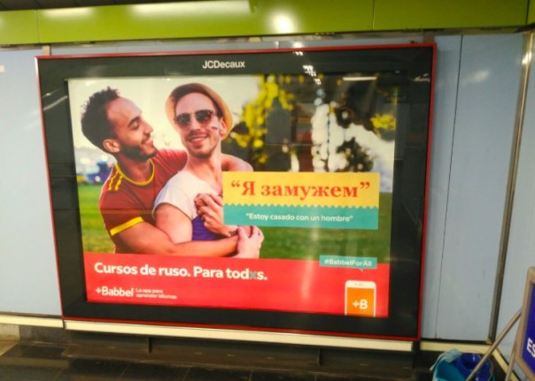 На фоне ажиотажа вокруг ЛГБТ-прайда в Мадриде, в испанском метро развешивают соответствующую колоритную рекламу. Так, одна переводческая школа развесила провокационные плакаты, где изображены испанский и российский футбольные болельщики нетрадиционной ориентации, и на двух языках написано «Я замужем».