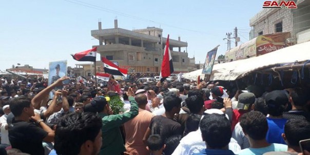 Военкор агентства САНА сообщил, что сотни жителей селения собрались на главной площади, подняв национальный влаг и скандируя лозунги с призывами сплотиться вокруг Сирийской армии, которая добивается побед над террористическими организациями в различных регионах страны.