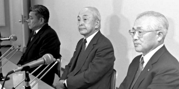 Сеити Саба (в центре) и Сугиитиро Ватари (справа) на пресс-конференции по случаю своей отставки