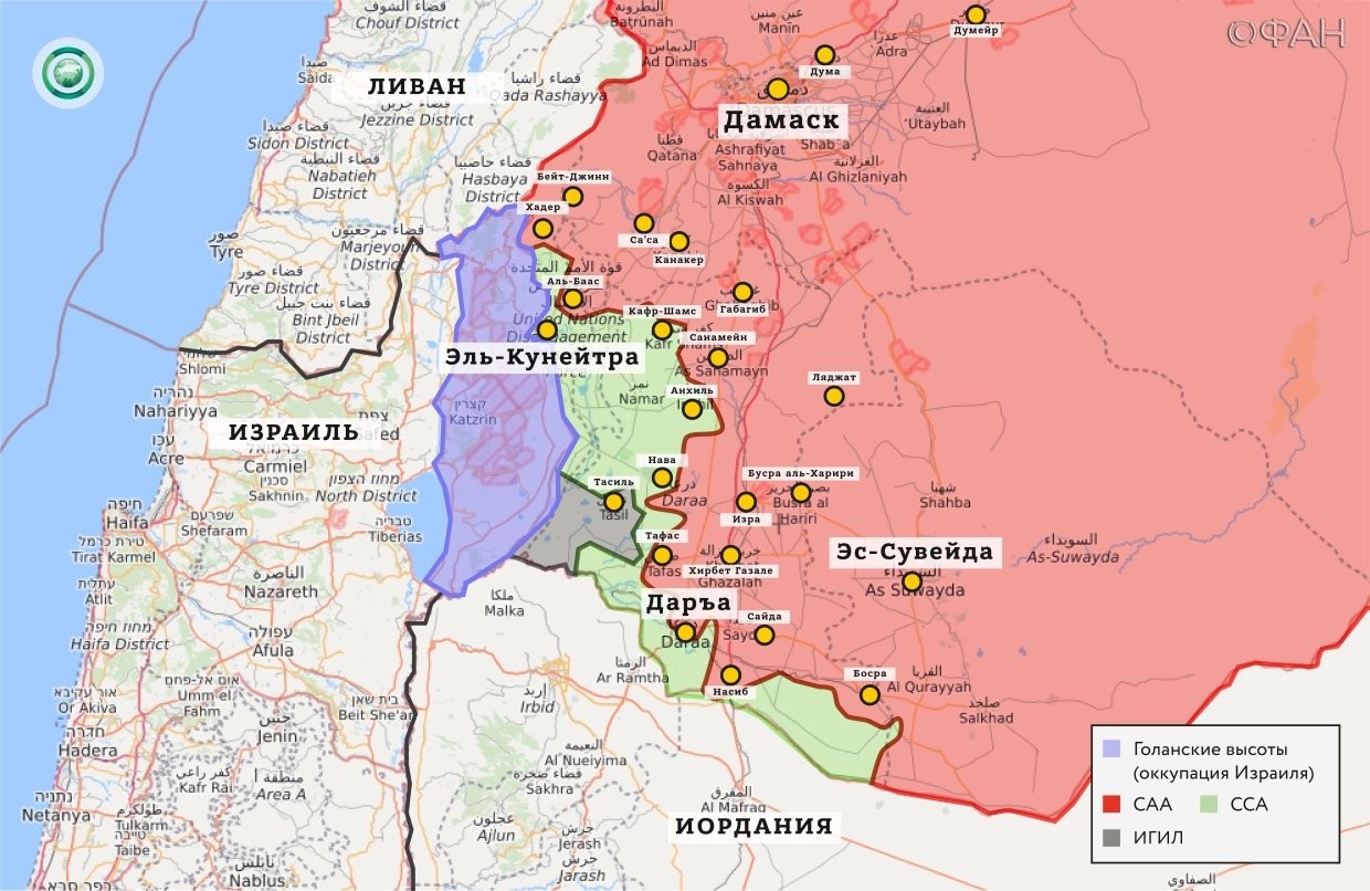 09.00 Армия Сирии на границе: военные обустраиваются в районе КПП «Нейсиб» вблизи территории Иордании. Ранее, боевики «умеренной оппозиции» оставили данный стратегически важный район, куда теперь стягиваются сирийские военные. Стоит отметить, что САА утратила контроль над границей с Иорданией 4 года назад и до недавнего времени КПП использовались боевиками для получения помощи с иорданской стороны.