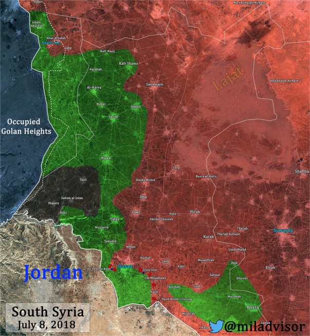 Кроме того, САА и ее союзники заняли крупный участок приграничной территории, дойдя до города Храб аш-Шам, а также блокировав с востока подконтрольную боевикам часть города Даръаа.
