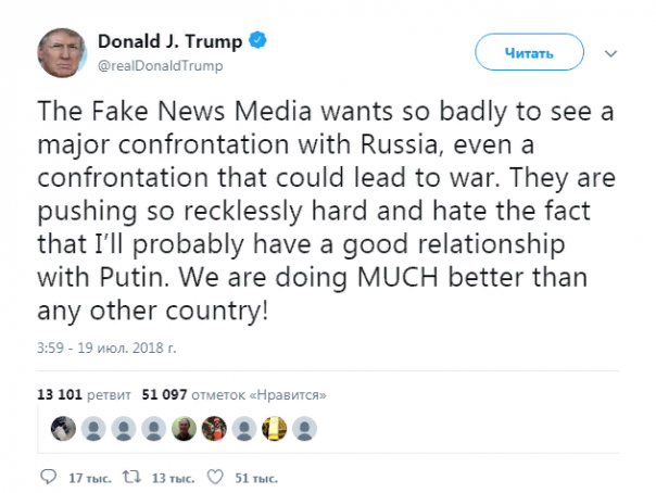 "Фейковые СМИ так сильно хотят увидеть серьезную конфронтацию с Россией, даже такую конфронтацию, которая может привести к войне. Они так сильно и безрассудно давят и ненавидят тот факт, что у меня, вероятно, будут хорошие отношения с Путиным", — написал Трамп в Twitter.