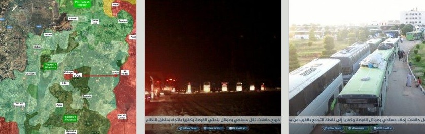 12.35 Сирия, провинции Идлиб и Алеппо – Завершилась эвакуация проправительственного анклава Фуа и Кафраи в провинции Идлиб. Все автобусы и около 7000 гражданских лиц в них, достигли города Алеппо. Как сообщают местные источники, жители подконтрольных боевикам «умеренной оппозиции» территорий закидывали автобусы камнями из-за чего в некоторых побиты стекла.
