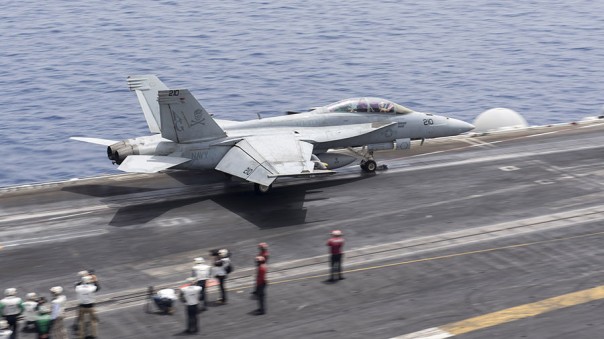 Истребитель ВВС США F-A-18E Super Hornet стартует с летной палубы авианосца "Гарри Трумэн" в Средиземном море