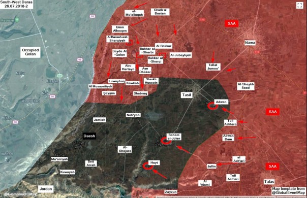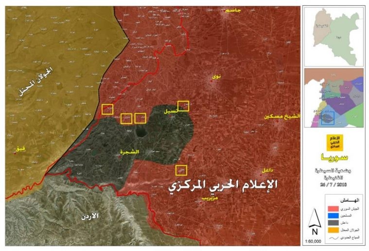 В рамках соглашения о примирении с джихадистскими группировками, Сирийская арабская армия заняла город Кунейтра (Quneitra), а также н.п. Аль-Хамидия (Al-Hamidiyah), Самадания аль-Гарби (Samadaniyah al-Gharbi), Аль-Раади (Al-Raadi) и Аль-Кахтания (Al-Qahtaniyah).