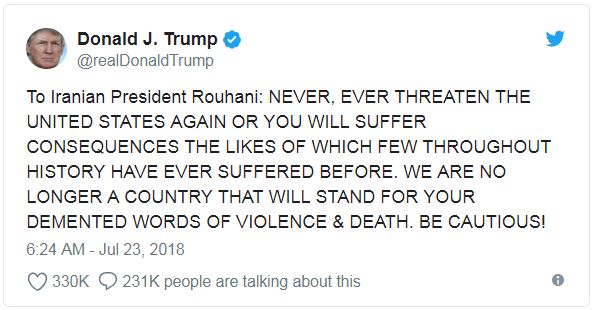 Информация от АВС приходит после того, как президент Трамп в своем твитере выдал тираду в воскресенье, в которой предупредил Иран: “Никогда, никогда не угрожать Соединенным Штатам снова, или вы будете страдать от последствий, подобных которым немногие на протяжении истории когда-либо страдали раньше..” Источник