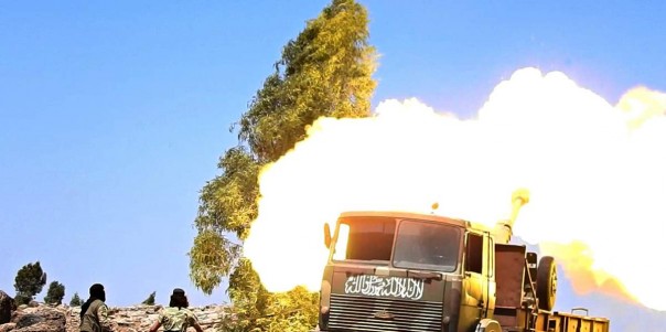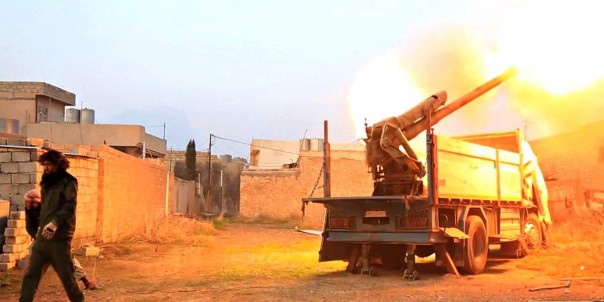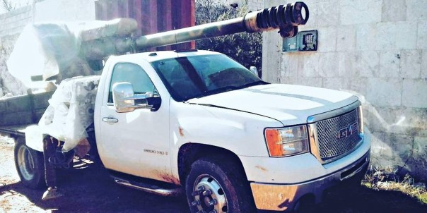 Упарываются подобным образом и правительственные войска Асада, поставив гаубицу на шасси внедорожного пикапа GMC. Интересно, на много ли выстрелов хватит несчастной машины?