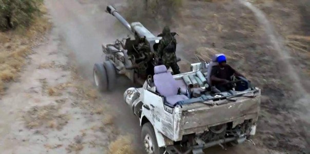 Во всемирной автолафетизации не отстают даже жестокие террористы из нигерийского «Боко Харам». Тут уже никакой брони — максимальная открытость всем ветрам и ласковому африканскому солнышку. Судя по тому, что орудие стоит на жёсткой сцепке, конструкцию используют как тачанку. Подлетел, развернулся, пальнул прямой наводкой — и смылся.