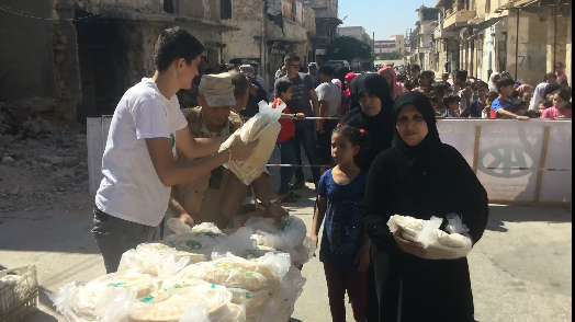 Помимо этого, в провинции Алеппо ежедневно, при содействии российских военных Центра по примирению от фонда А. Кадырова проходит акция по выдаче 1 тонны хлеба в различных районах города.