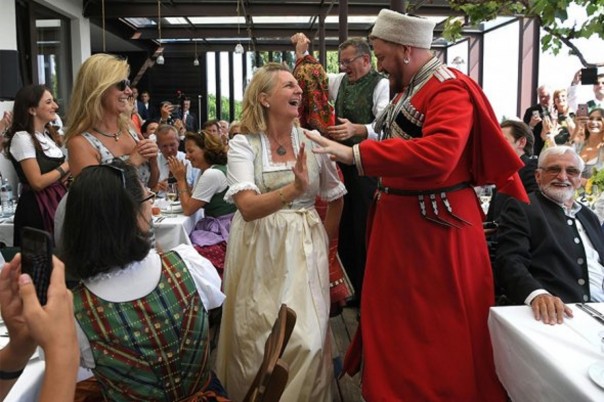 Всего на торжестве присутствовало около сотни гостей. Самый знаменитый среди них — Владимир Путин — прилетел в аэропорт Граца, откуда на автомобиле отправился к месту проведения свадьбы. Как отмечает издание, прибывший вскоре после российского президента казачий хор заставил министра Кнайсль пуститься в пляс. Танцевала она и с Путиным, который вскоре покинул свадьбу вместе с канцлером Австрии Курцем.