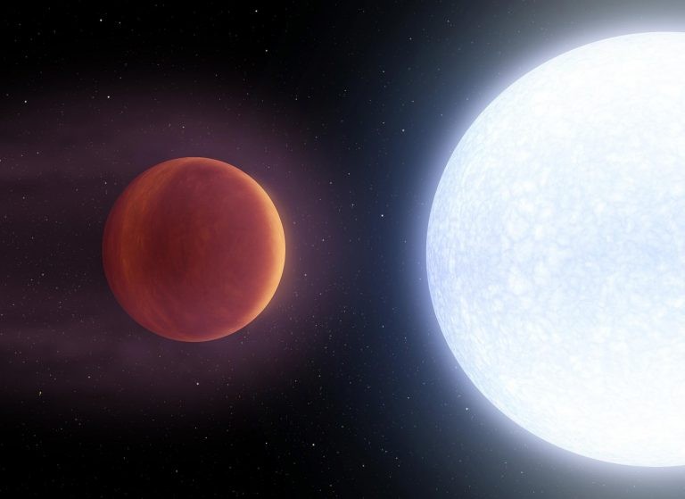 Если бы мы могли побывать на KELT-9b, то увидели бы поистине невероятное зрелище: огромную звезду (ее видимый размер в 70 раз превышает размер солнечного диска при наблюдениях с Земли) на красно-оранжевом абсолютно безоблачном небе. Подобный цвет обусловлен атомами железа и титана. Что касается облаков, то мощное излучение звезды попросту не даст им сформироваться на дневной стороне.
