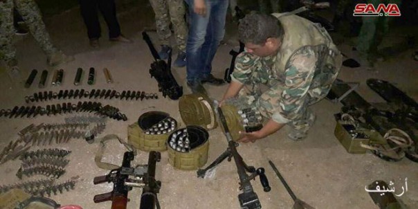 Корреспондент агентства САНА сообщил из провинции, что в ходе зачисток сапёрами освобождённых от бандформирований районов был найден склад оружия и боеприпасов, оставленный боевиками перед их отправкой на север Сирии.