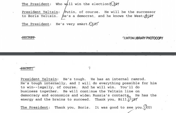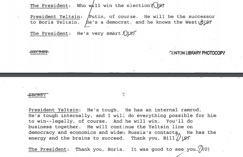 "Мне понадобилось много времени, чтобы обдумать, кто может стать следующим российским президентом в 2000 году. К сожалению, тогда я не мог найти ни одного кандидата из действующих людей. В конце концов я наткнулся на него, это Путин", — сказал Ельцин Клинтону восьмого сентября 1999 года.