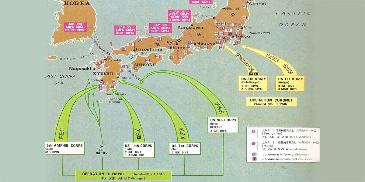 Первым этапом должна была стать операция «Олимпик» — десантирование на южный остров Японского архипелага, Кюсю. Через 90 дней после него Макартур предполагал высадку на Хонсю и марш к Токио. Операция получила кодовое наименование «Коронет».