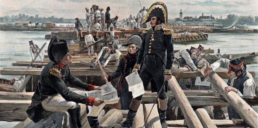 Солдаты-понтонёры собирают понтонный мост на остров Лобау во время австрийской кампании, 1809 год