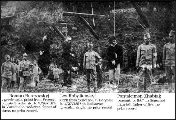 Увы, фронт не дошёл до большей части Лемковины, где за выход 60 000 человек из унии было уничтожено не только всё православное духовенство, но и 300… униатских клириков – лишь по подозрению в тайных симпатиях к России (один из них, Роман Березовский, вдовец, воспитывавший троих детей, на снимке повешенных слева). Повальному аресту была подвергнута также лемковская интеллигенция.