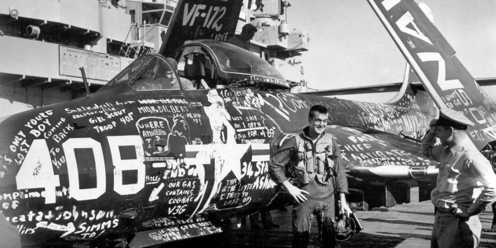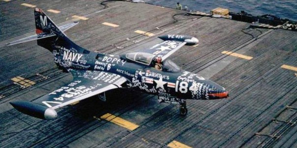 На этом фото — виновник торжества, пилот очередного заблудившегося F2H «Баньши», не особенно огорчённый получившимся «камуфляжем». Надпись на носу гласит: «Это ваш мальчик-потеряшка».