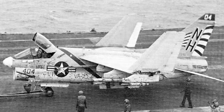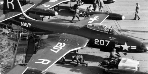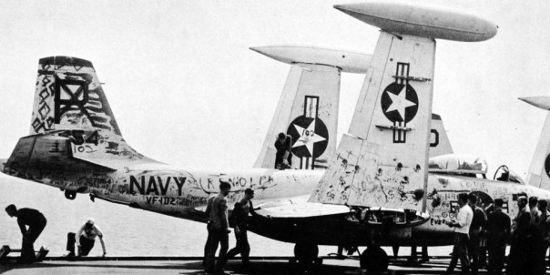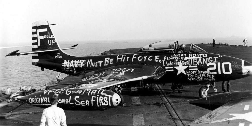 А вот этому F2H «Баньши» с авианосца «Корал Си» CV-43 отказали в принадлежности к военно-морским силам. NAVY зачёркнуто, вместо этого чужие техники предположили, что лётчик «должно быть из ВВС» — сухопутная крыса, то бишь.
