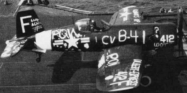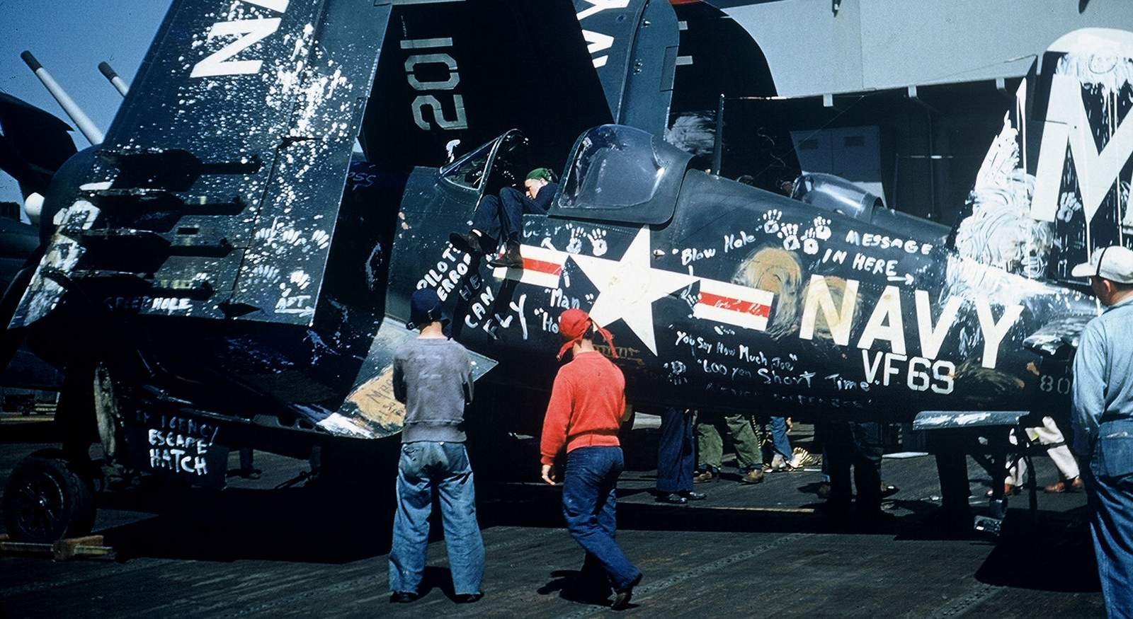 Вот F4U «Корсар» по ошибке сел не там и получил много полезных рекомендаций, нанесённых на крылья и фюзеляж