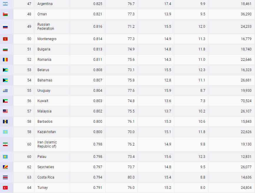 Всего в рейтинг вошли 189 стран, среди которых Россия заняла 49-е место. Группу стран с очень высоким уровнем человеческого развития составили 59 государств, из стран ближнего зарубежья в их число попали также Эстония (30-е место), Польша (33-е место), Литва (35-е место), Латвия (41-е место), Белоруссия (53-е место) и Казахстан (58-е место).