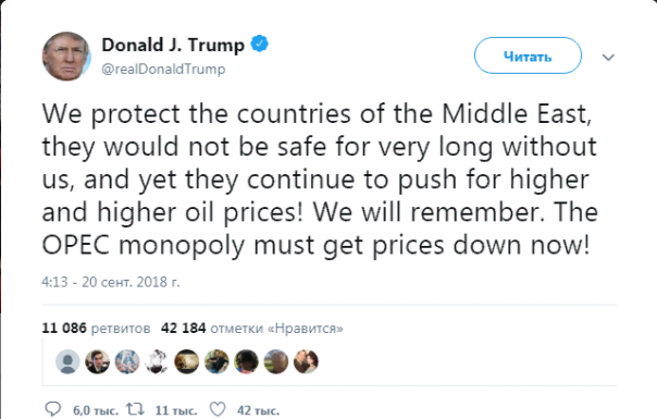 "Мы защищаем страны Ближнего Востока, они не смогут долгое время находиться в безопасности без нас, и тем не менее они продолжают добиваться повышения цен на нефть" — написал американский лидер в своем официальном Twitter-аккаунте. Он также назвал картель "монополией".