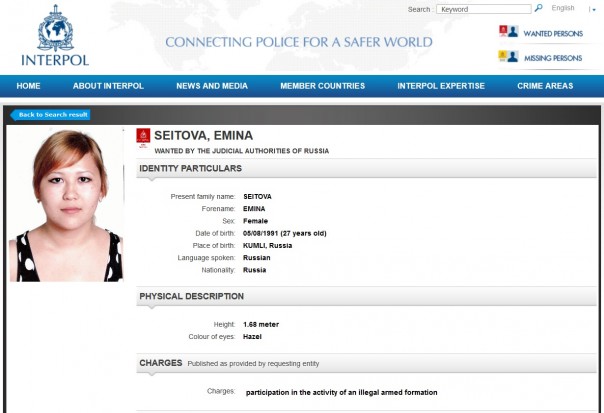 Согласно сведениям на сайте Интерпола, Эмина Сеитова объявлена в розыск по запросу России как участница зарубежного незаконного вооруженного формирования. Уроженка селения Кумли Ногайского района Дагестана Эмина Амирхановна Сеитова значится также в списке террористов и экстремистов на сайте Росфинмониторинга. Источник