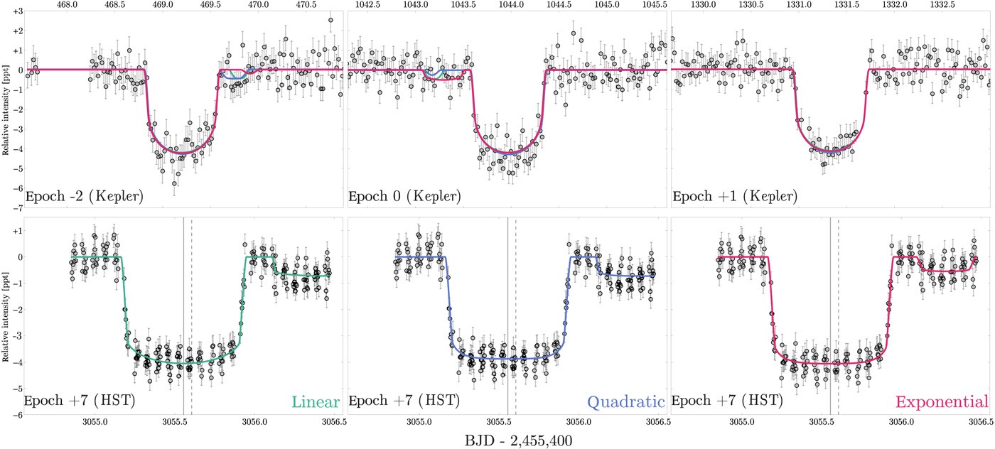 Для проверки этого предположения астрономы воспользовались помощью телескопа Hubble. В октябре прошлого года он пронаблюдал очередной транзит Kepler-1625b. Как и Kepler, Hubble зафиксировал второе, намного менее заметное уменьшение яркости звезды, которое согласуется с версией спутника.