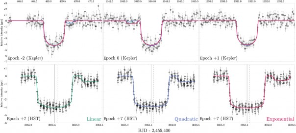 Затем, астрономы проанализировали собранные космическим телескопом Kepler данные о шести тысячах транзитах 284 экзопланет. У 283 из них астрономам не удалось найти ничего выходящего за рамки погрешности наблюдений. Но один из миров весьма заинтересовал исследователей.
