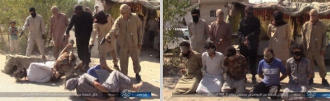 11.50 Сирия, провинция Дейр-эз-Зор Боевики ИГ* опубликовали фотоотчет с массовой казни, устроенной ими на подконтрольных территориях в провинции Дейр-эз-Зор. Как заявили боевики, все пятеро казненных были шпионами курдских формирований и оказывали им поддержку в ведущемся в настоящий момент наступлении.