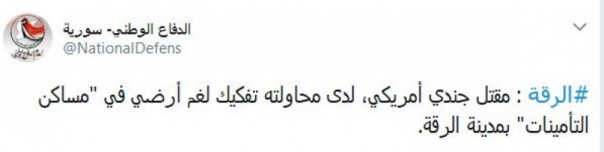 Сообщение опубликовано в официальном микроблоге NDF в Twitter. Уточняется, что американский военный погиб, пытаясь разобрать наземные мины в здании госбезопасности в Ракке.