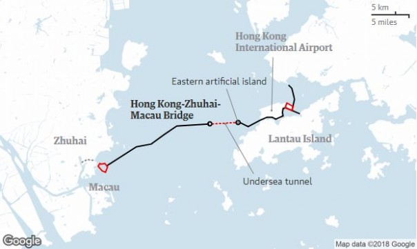Инженеры создали сложную структуру, которая состоит из нескольких частей надводного моста общей протяженностью 22,9 километра, подводного тоннеля, длина которого 6,7 километра, нескольких искусственных островов, а также специальных пограничных КПП — между материковым Китаем, Гонконгом и Макао в силу их отношений обязателен пограничный контроль.