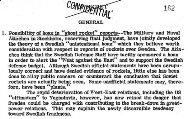 «Военно-морской атташе США в Стокгольме считает, что шведские военачальники молчаливо одобрили мистификацию, дабы усилить противостояние Запада и Востока и увеличить военный бюджет Швеции. Официальные лица страны мало сделали для того, чтобы развеять беспокойство и опровергнуть ложную информацию о советских ракетах. Это создало почву для дальнейших спекуляций. Шведские власти опасаются, что на них может лечь ответственность за разлад между великими державами», — отмечается в дайджесте от 26 августа.
