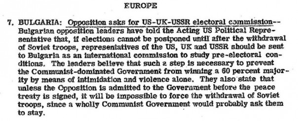 В странах Европы, освобожденных от фашизма, проходят выборы. В донесении от 23 сентября разведка указывает, что «в условиях советской оккупации Болгарии нельзя допустить, чтобы коммунистическое правительство получило конституционное большинство (60%) голосов, поскольку в этом случае не удастся добиться вывода советских войск из страны».