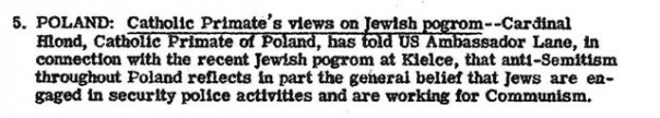 После окончания войны по Польше прокатилась волна еврейских погромов. Самый крупный произошел 4 июля в Кельце: были убиты, по разным сведениям, до 50 человек. "Католический предводитель Польши кардинал Хлонд в связи с недавним еврейским погромом в Кельце сказал послу США Лэну, что антисемитизм во всей стране частично отражает общее убеждение, согласно которому евреи активно сотрудничают с полицией безопасности и работают на коммунистов", — сообщает CIG Трумэну 10 июля.