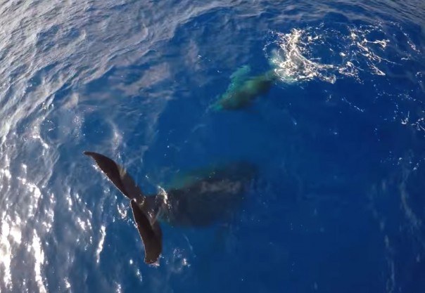 Горбатые киты являются крайне подвижными животными. Видео, снятое с дрона, показывает его вертикальное погружение и выставленный наверх хвост.