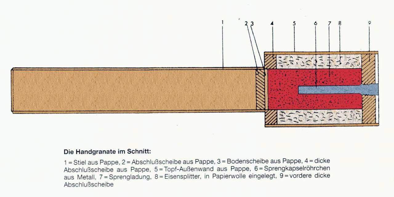 Новая версия «Фольксхандгранате-45» была до предела упрощённой и дешёвой копией всё той же классической «колотухи». Но на этот раз — никакого дерева, бетона и металла: и корпус, и рукоять гранаты делали из… картона. Заряд взрывчатого вещества также размещали в картонной трубке.