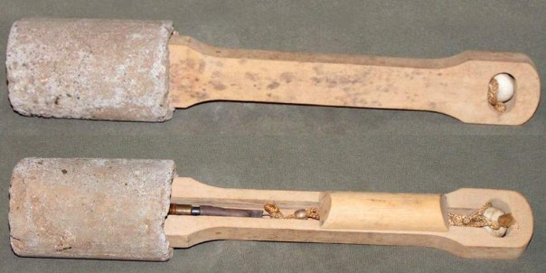 Справка. Колотухой, или колотушкой, прозвали немецкую «Штиельхандгранате», то есть «гранату с длинной рукояткой», за характерную форму, которую ей придавала, собственно, та самая рукоятка. Граната состояла на вооружении в Германии с 1916-го до 1945-го и является одним из самых узнаваемых элементов вооружения немецкого пехотинца обеих мировых войн.